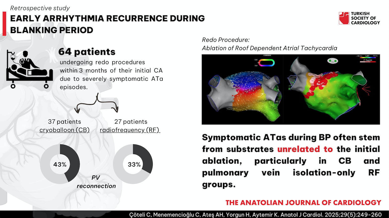 In this retrospective analysis of 1482 patients who underwent CA for AF in the Hacettepe University Department of Cardiology Electrophysiology Unit between January 2017 and September 2023, 122 patients had documented ATa during the BP. Among these patients, 57 were referred for electrophysiological study (EPS) and/or redo CA due to severe symptoms [European Heart Rhythm Association (EHRA) 3-4] related to ATa episodes. Additionally, 7 patients who had their index procedure at another center were admitted to our center with ATa and referred for EPS and/or redo CA. In total, 64 patients were enrolled in the study (