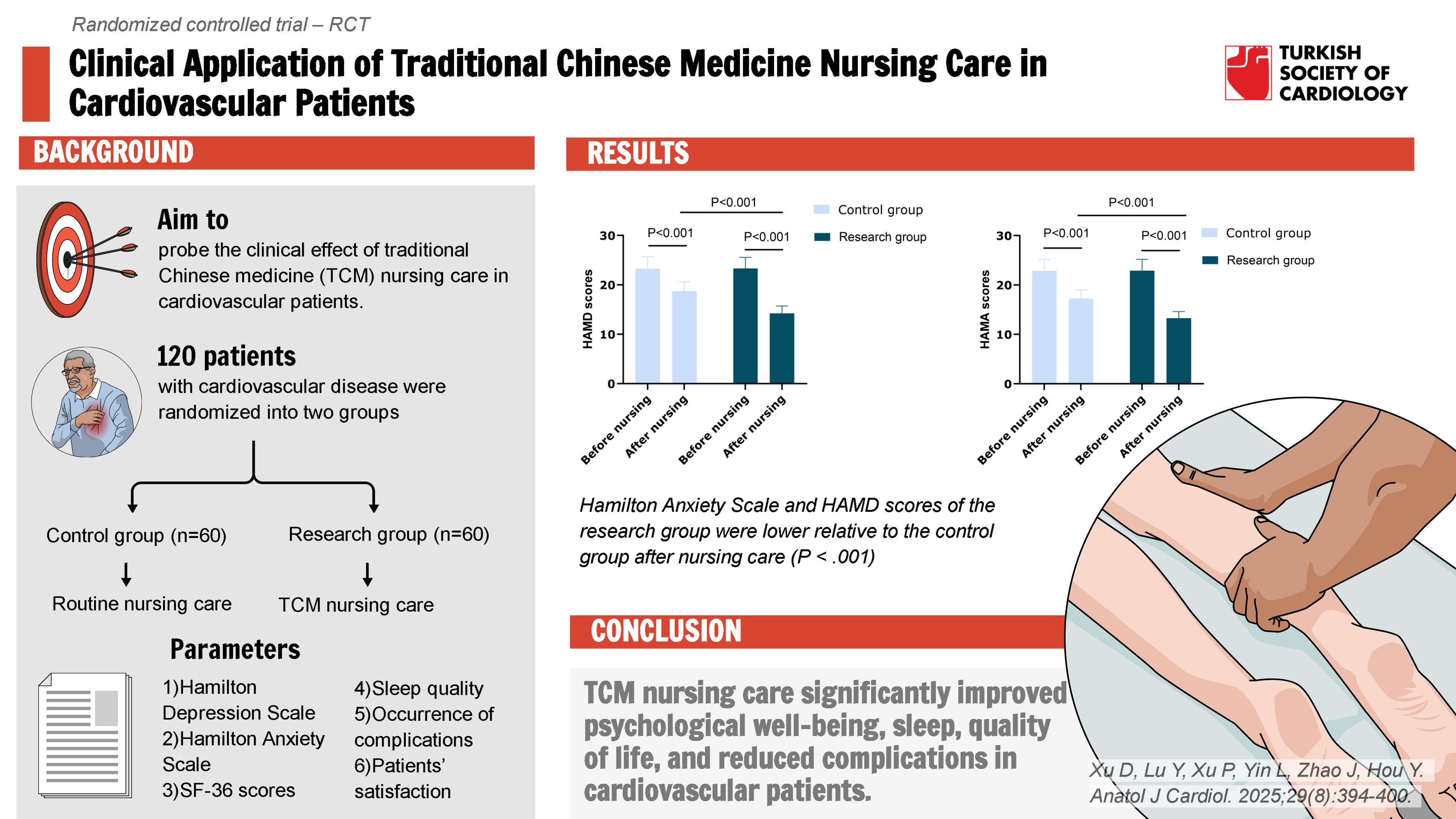 - After traditional Chinese medicine (TCM) nursing care, Hamilton Anxiety Scale, Hamilton Depression Scale scores, sleep quality scores, and complication rate of patients with cardiovascular diseases were significantly reduced.
