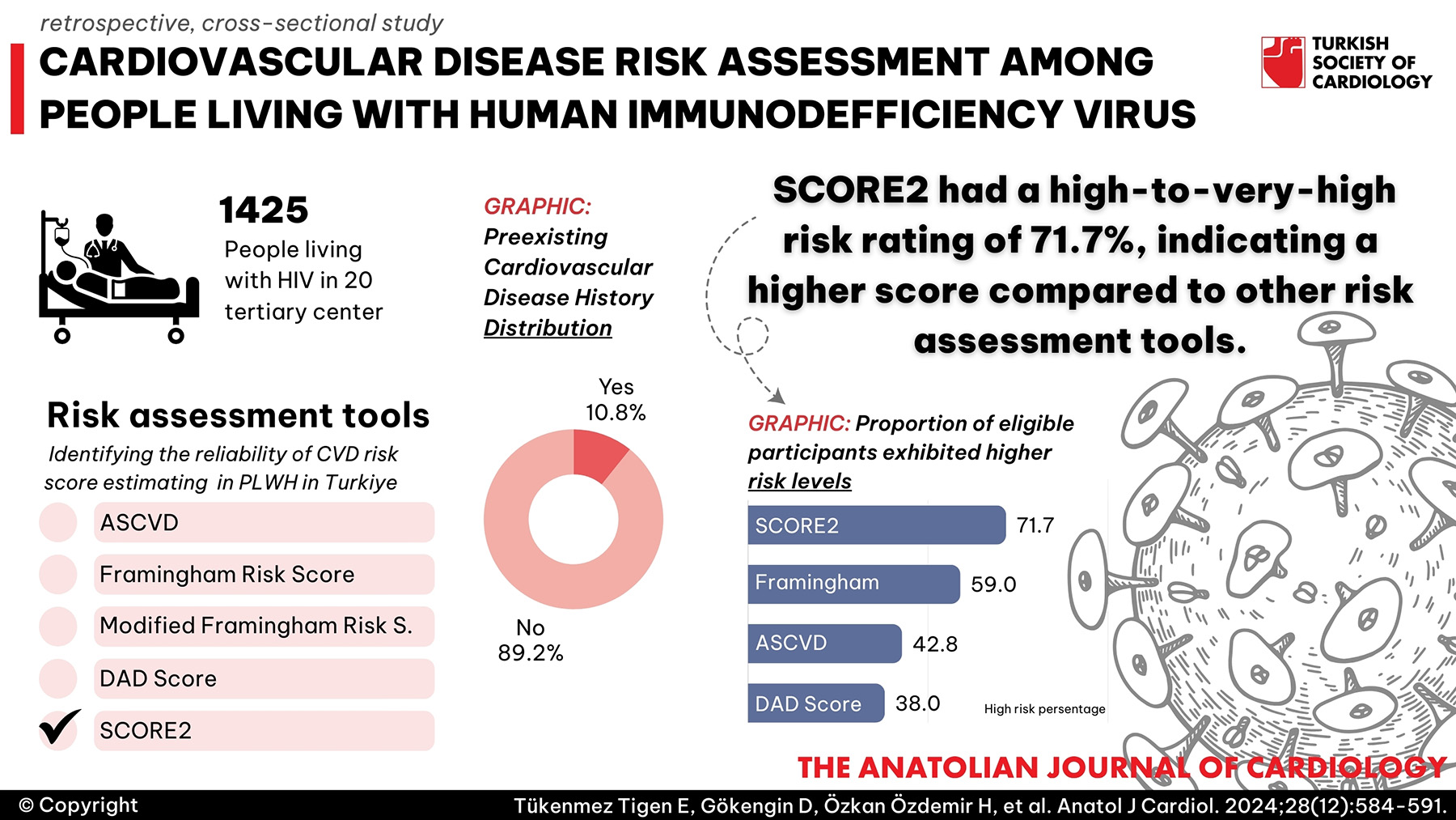 To our knowledge, this study represents the first large-scale multicenter investigation in Türkiye evaluating the CVD risk among PLWH. It utilizes various CVD risk scores, including SCORE2, to assess risk and determine eligibility for lipid-lowering treatment in accordance with commonly used guidelines. Additionally, the study aims to assess the prevalence of diagnosed CVD among PLWH.