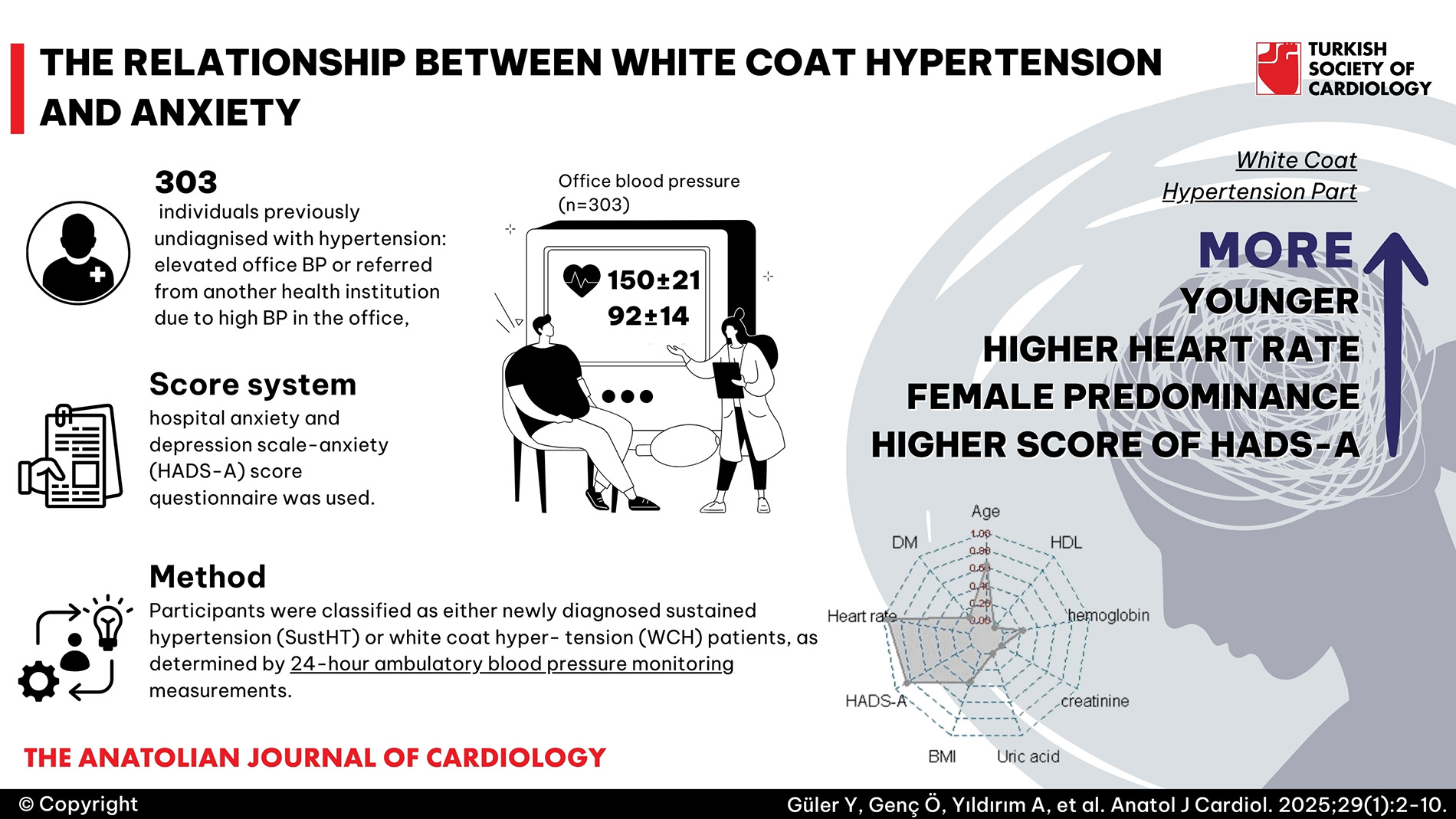 Background: To investigate the relationship between anxiety and white coat hypertension (WCH) using the hospital anxiety and depression scale-anxiety (HADS-A) score.
