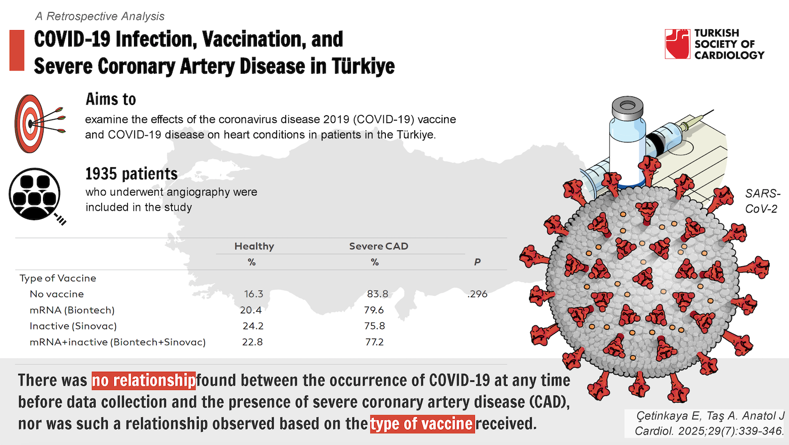 This retrospective cross-sectional study involved accessing the medical records of patients who underwent angiography at the study hospital between November 2019 and October 2023. Data for the study were collected and evaluated between November 2023 and January 2024. The study was initiated with the approval of the Ethics Committee on April 28, 2023, under protocol number E-95531838-050.99-83973. A total of 1935 patients who underwent angiography at the authors’ cardiology clinic between November 2019 and October 2023 were included in the study. Due to only being able to access vaccination data for living patients, vaccination-related analyses were conducted on 1629 patients and comprising 1598 patients who underwent percutaneous coronary intervention for significant CAD as determined through coronary angiography, and 339 patients for whom an operation decision was made. Both of them accepted as having severe CAD. Coronary angiographies of patients were performed and evaluated by expert interventional cardiologists working at the study hospital using Siemens Heathcare GmbH, Henkestr, 127 91052 Erlangen, Germany, Model 10562561, devices available at the study hospital, both during regular working hours and on-call duties.