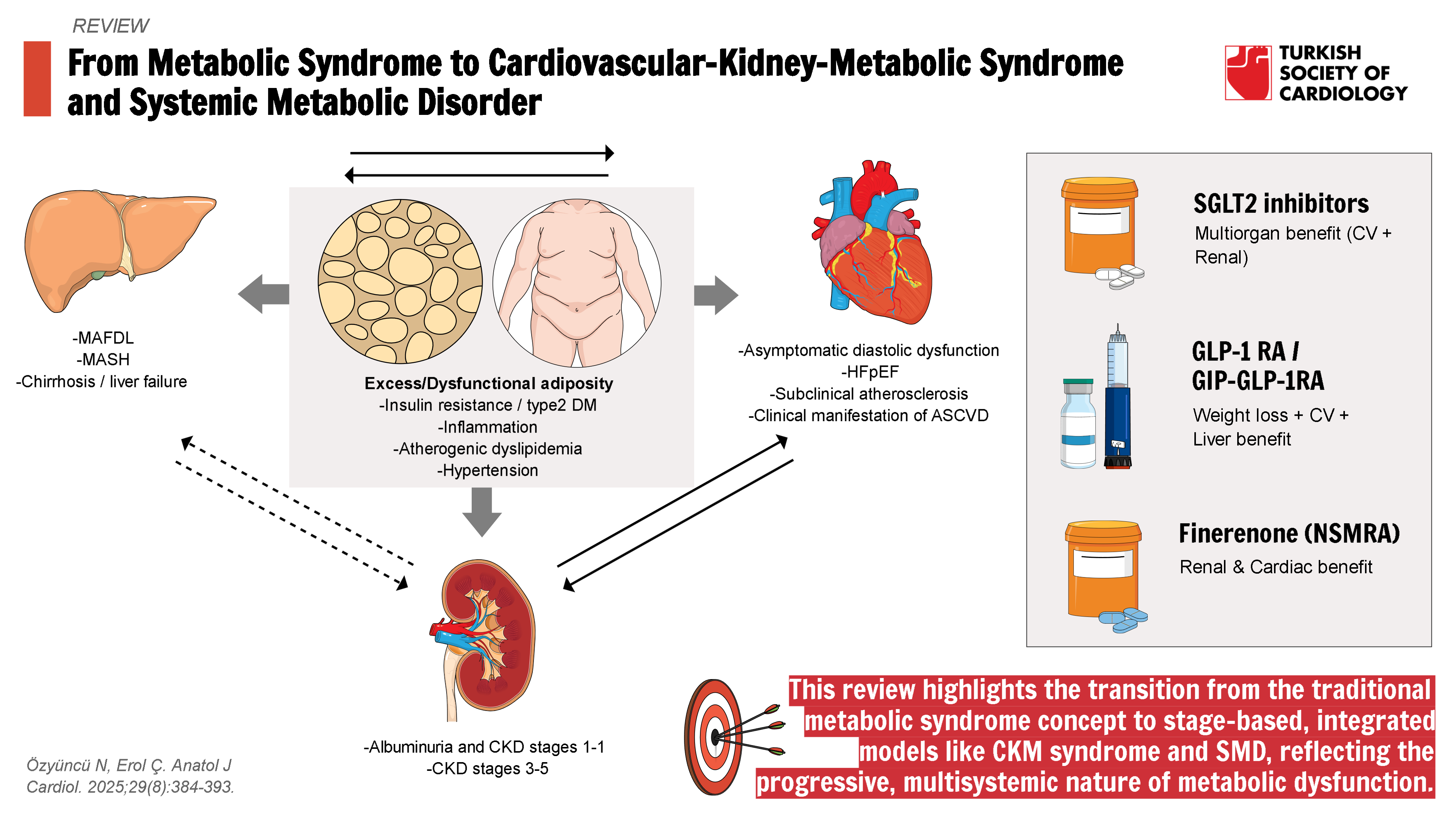 Once considered as distinct entities, conditions such as obesity, type 2 diabetes mellitus (DM), atherosclerotic CVD, heart failure (HF), chronic kidney disease (CKD), and metabolic dysfunction-associated steatotic liver disease (MASLD) are now recognized as interconnected disorders that share common pathophysiological pathways.5 Many concepts were proposed to define the shared mechanisms. The concept of “cardiorenal syndrome” illustrates the bidirectional relationship between heart and kidney dysfunction, while “metabolic syndrome” or “cardiometabolic syndrome” highlights the close association between excess adiposity, metabolic risk, and cardiovascular outcomes.6-